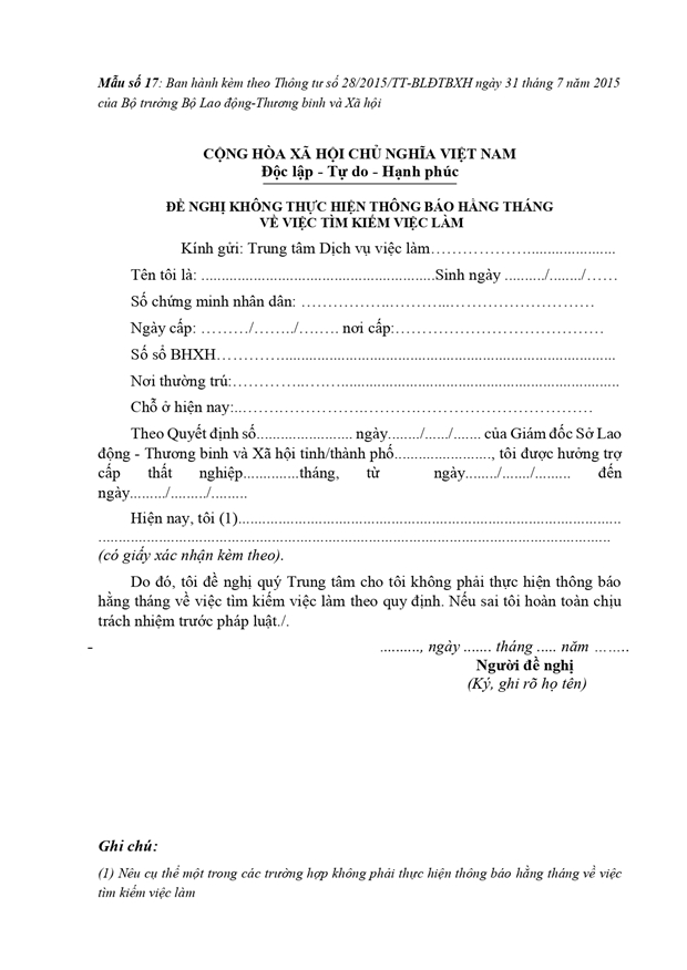 - Đề nghị không thực hiện thông báo hằng tháng về việc tìm kiếm việc làm (Mẫu số 17 ban hành kèm theo Thông tư số 28/2015/TT-BLĐTBXH)